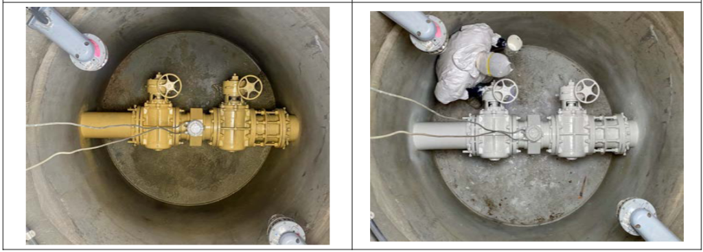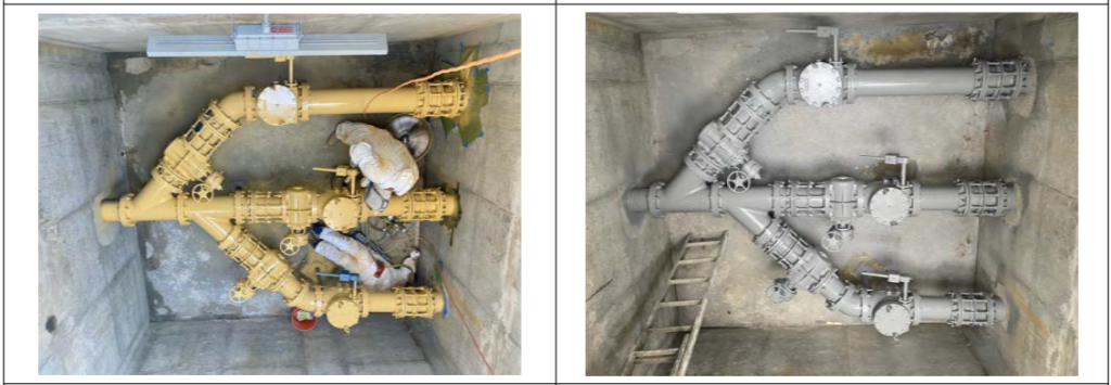 Corrosion Protection Coating Application at Market Center Lift Station’s Atmospheric (e.g. Valve Rooms) and Immersion (e.g. Wetwell) Piping Systems at City of Terrell, Texas. Per owner’s coating specification, Immersion Piping System required application of three layers of Sherwin Williams Macropoxy coating system (i.e. primer, intermediate, and topcoat). Atmospheric Piping System also required first two layers of Sherwin Williams’ Macropoxy coating and Polyurethane topcoat. MADEROs Scope Of Work also included Abrasive Surface Preparation with Dustless Sponge Jet Abrasive System, Quality Control Testing (e.g. Wet Gauge, Holiday, and Adhesion Pull) and Quality Assurance.